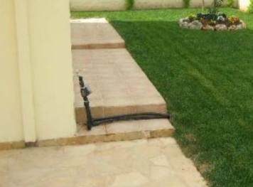 На территории дома, огороженного забором – зеленый газон, сад, искусственный ландшафт.